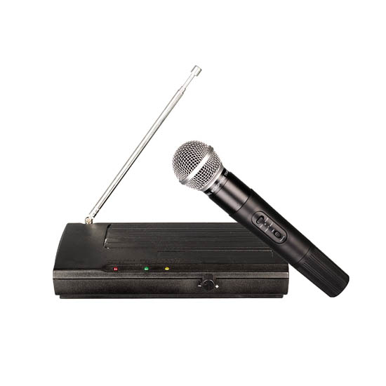 Displayed here is a wireless microphone with two antennas for better receiving ability. The simple and clear control is designed for easy operation. This wireless microphone system is appointed to enhance your home theater.