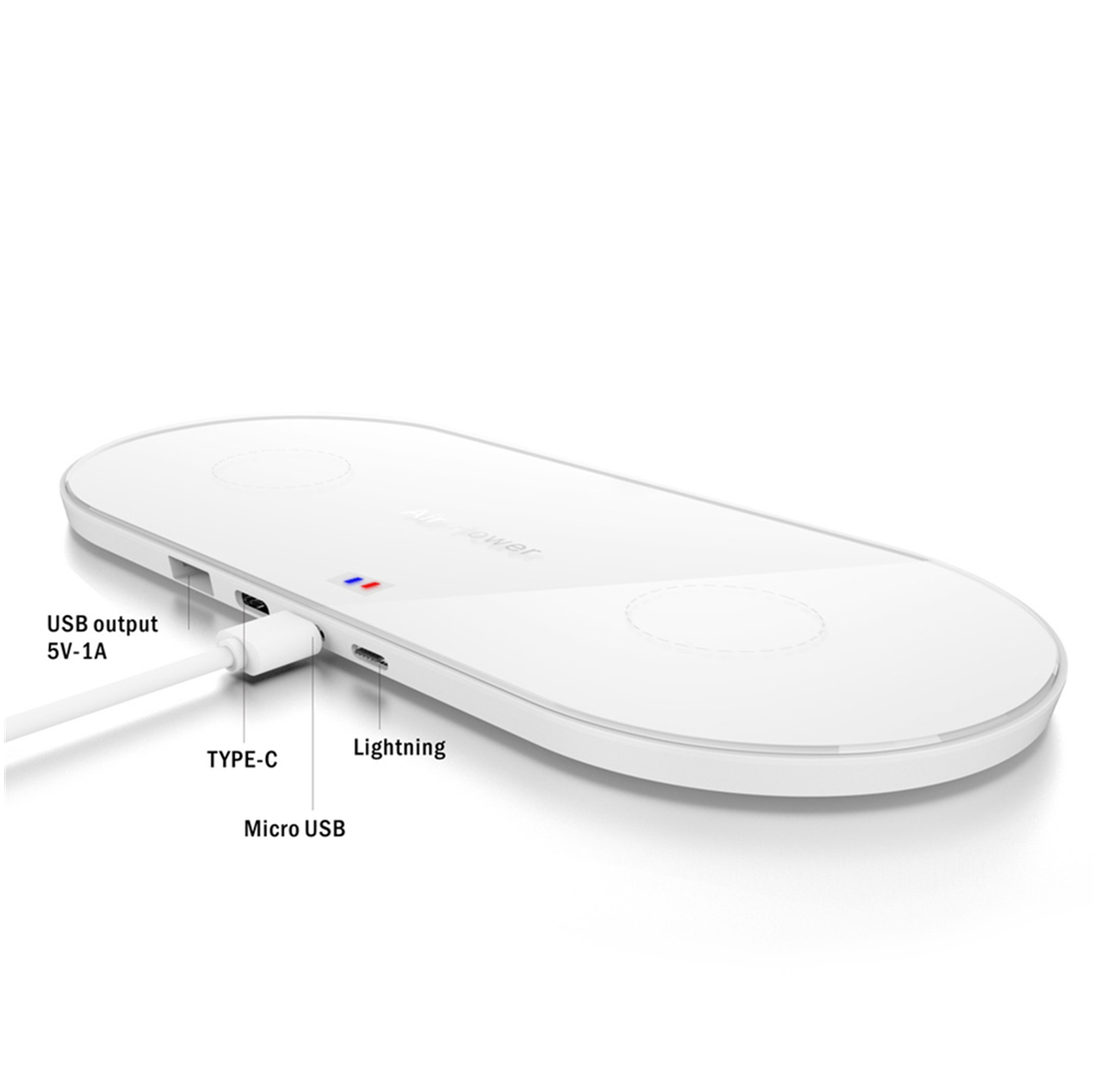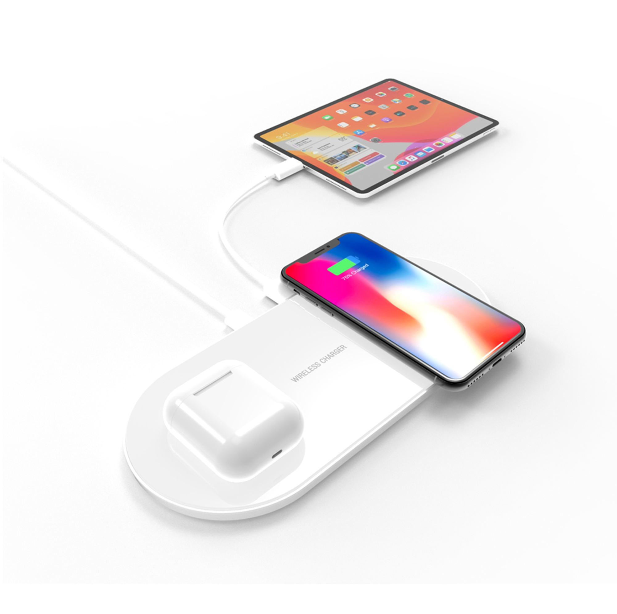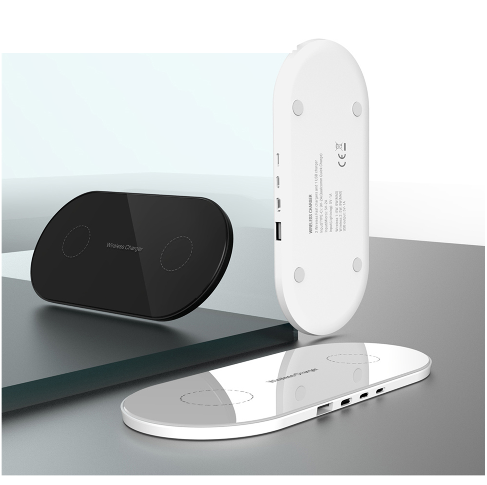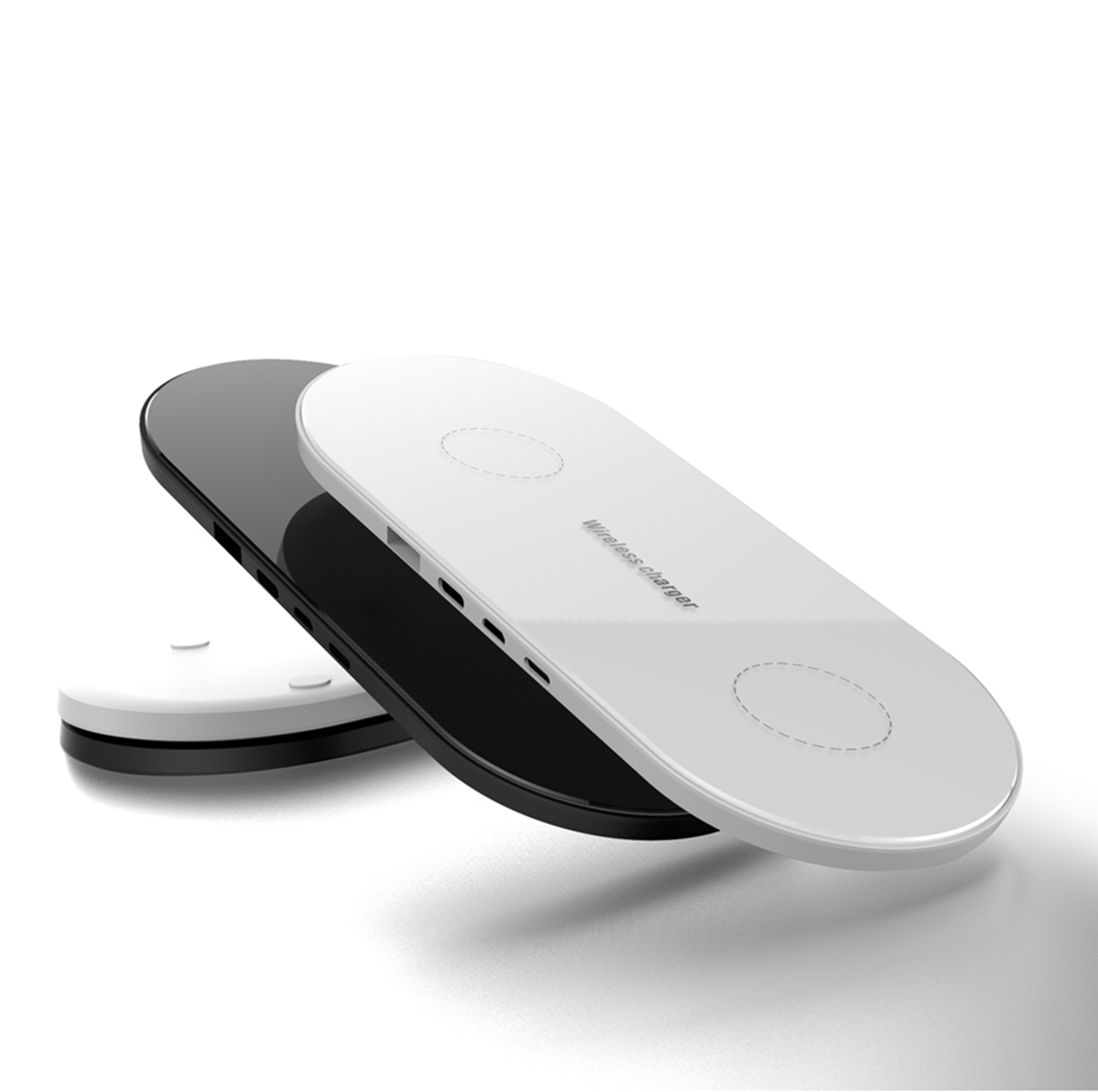 Wireless QI fast charger simultaneously charging two devices via up to 18W output