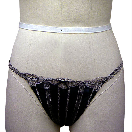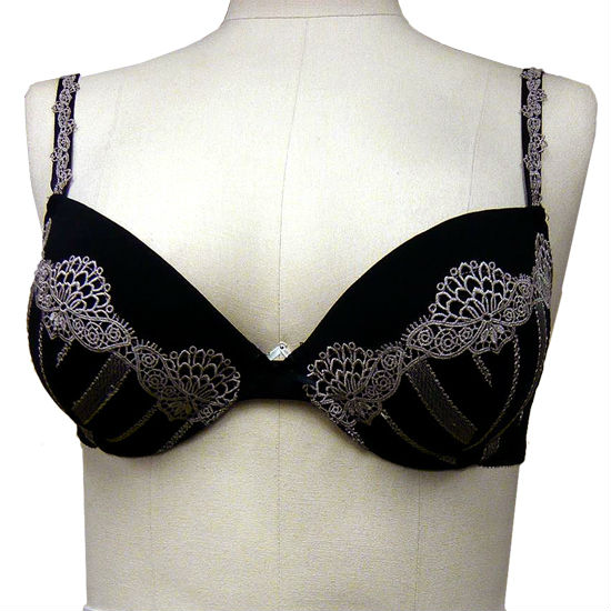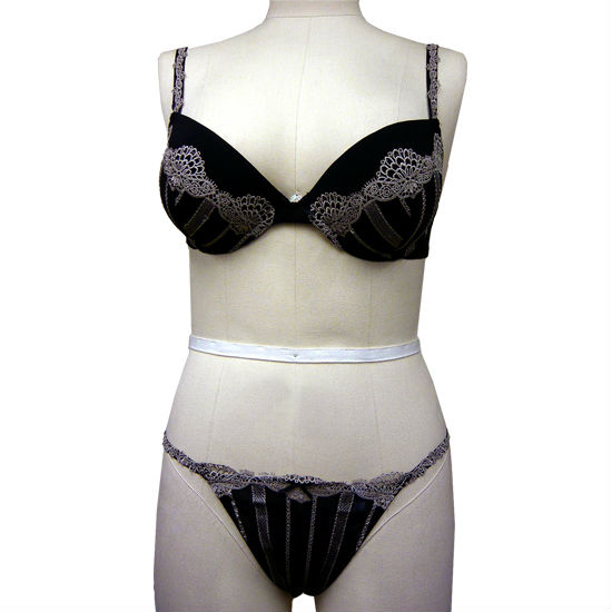 - Shoulder straps trimmed with filigree embroideries in light gray.