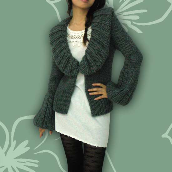 This is a women's thick knitted cardigan in dark grey. The cardigan has long blouson sleeves. It also has chunky shawl collar.