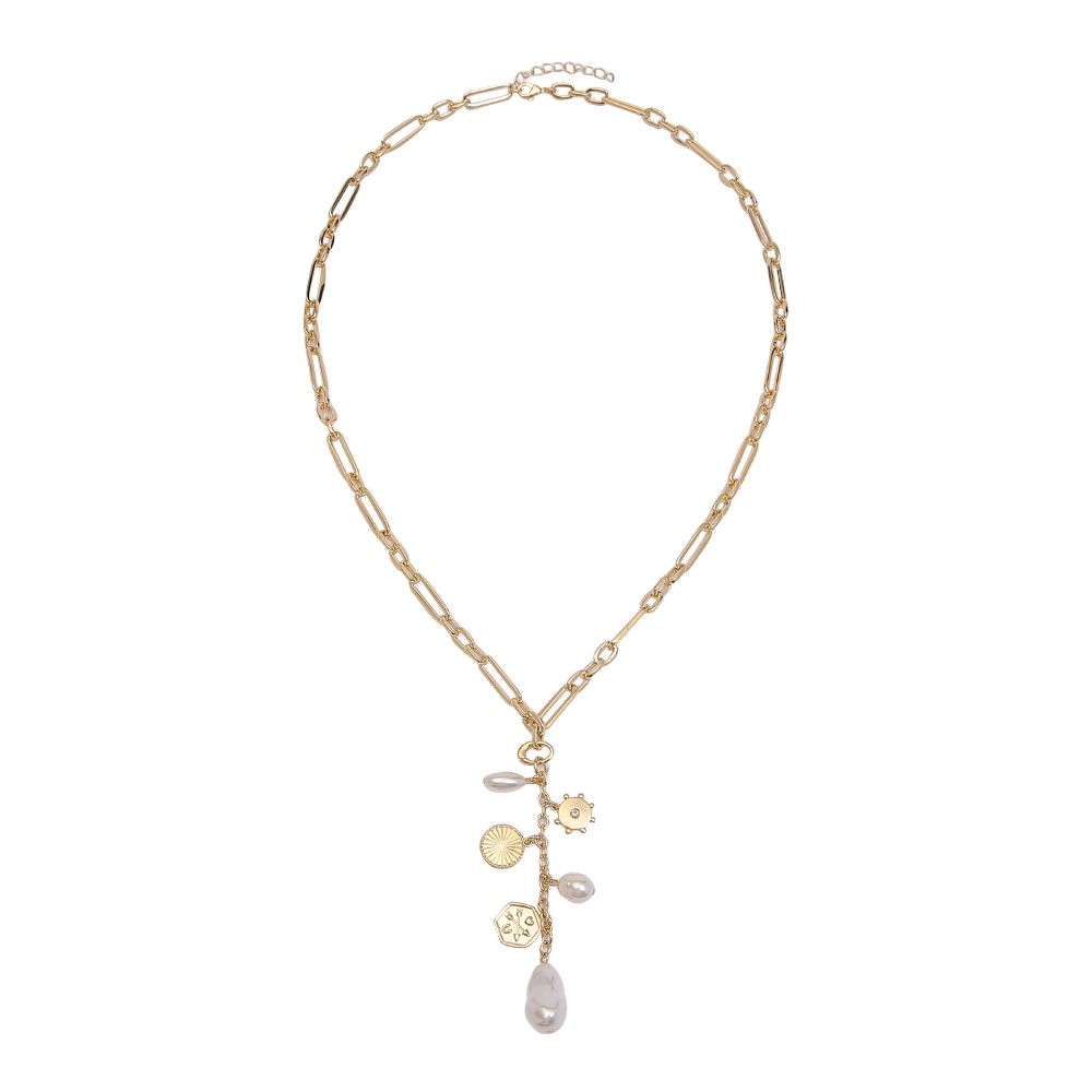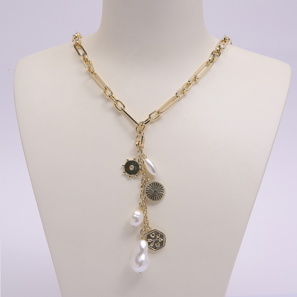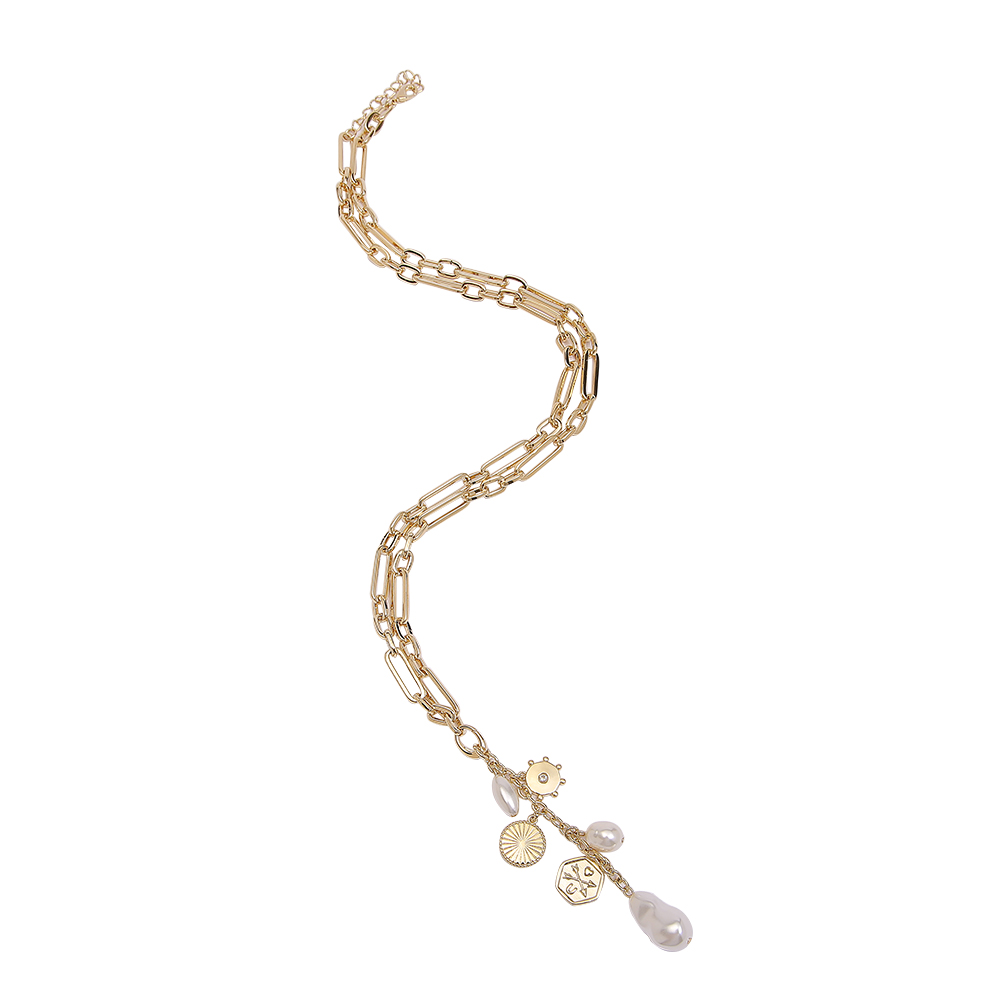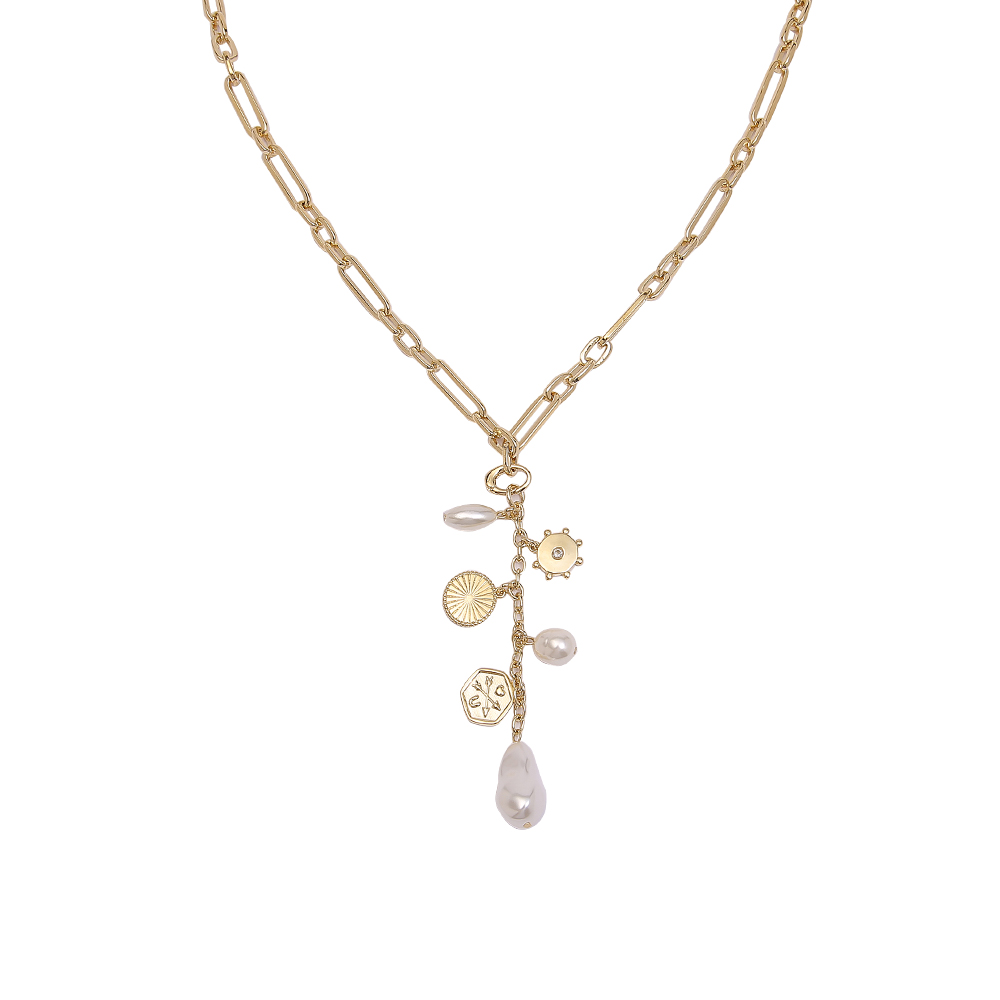 Women's Fashion Brass Jewelry Gold Plated Paper Freshwater Pearl Coin Pendant Chain Single Layer Necklace