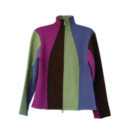The featuring cloth is a zip-up jacket with a stand collar for ladies and women. The jacket is divided into several parts in different colours, which are pink, brown, green and purple, making it a young and vibrant leisure cloth which is easy-to-match in style.