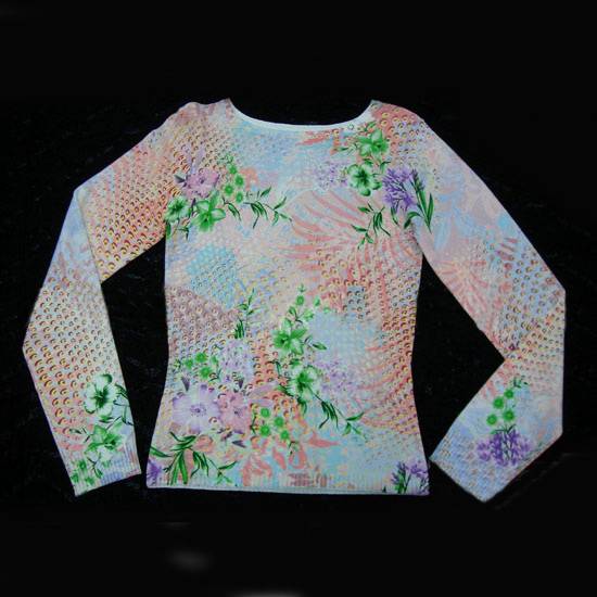 The featuring cloth is a long-sleeve knitted pullover for ladies and women to wear for leisure occassions. It has a colourful pattern of flowers and leaves, creating a spring and vivid style which is young and fashionable.