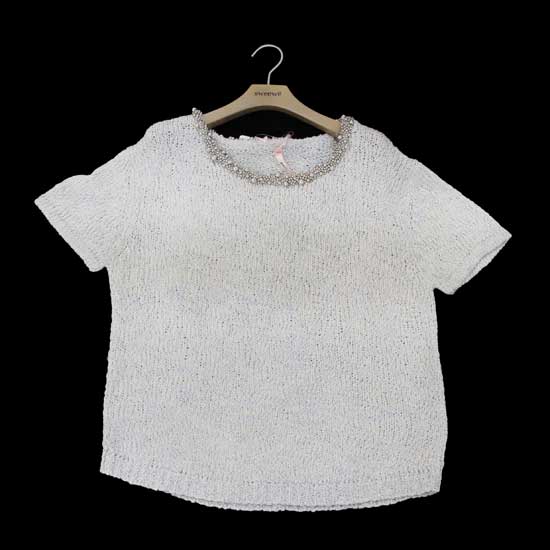 This women’s pullover comes with a round neckline and short sleeves. It is made of 40% cotton, 40% polyester and 20% métallique, which ensure wearing comfort and softness. The eye-catching beaded decorations are added round the neckline for extra style.