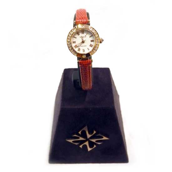 This women's quartz analog watch touts a big round case with sparkling stones on the golden bezel. The white dial is crafted with golden Roman numeral hour markers and three golden hands. This elegant wristwatch is finished with an ultra-thin red snakeskin-like strap, evoking a sense of vogue.