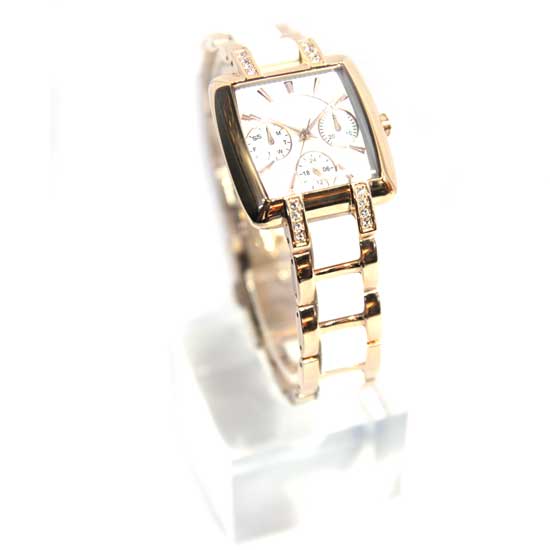 This pictured watch is designed with style and elegance. The color combination of white and gold brings a classy vibe. The sleek band of stainless steel makes this watch a favorite for the ladies.
