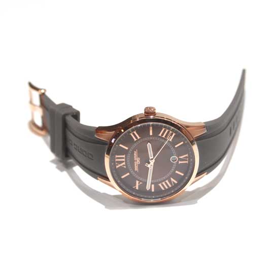 This is a quartz analog watch that features a round case in rose gold and a pair of black silicone straps. The Roman numerals showcase a classic and elegant touch. This well-made watch is a great addition to your watch collection.
