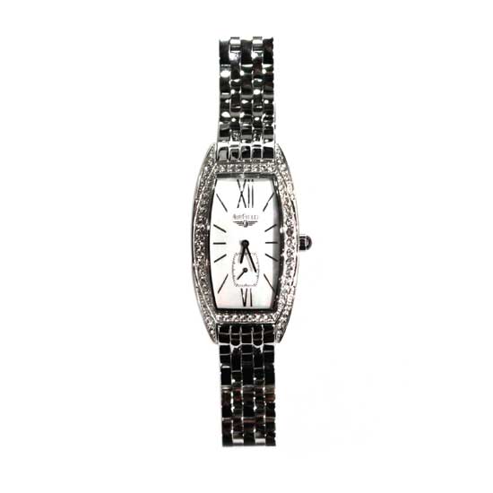 This is a women’s watch that runs on a high-precision quartz movement. It is finely made with a steel structure for first-rate durability. The rectangular case is fully paved with dazzling stones for a decorative touch.