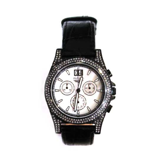 This is a women’s watch that is made with a black leather strap for modern elegance. This jewelry watch has a black case matching shimmering stones on the bezel. This fashionable wristwatch is surely an ideal choice to complete your outfit.