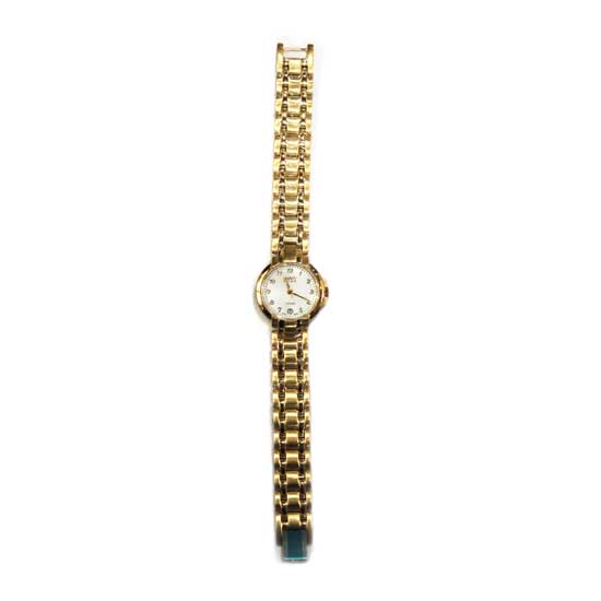 This is a chic women’s quartz watch that comes in an allover golden color. The stainless steel construction offers an extra-long service life. The white dial face comes with three hands, an Arabic numeral display and a date display.