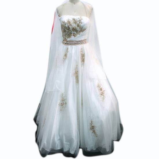 This women's wedding dress flaunts embroidered beads in a floral pattern on the pleated bust. The acrylic midriff boasts the slim body shape of the bride. The skirt features double layers, allowing for an elegant style.