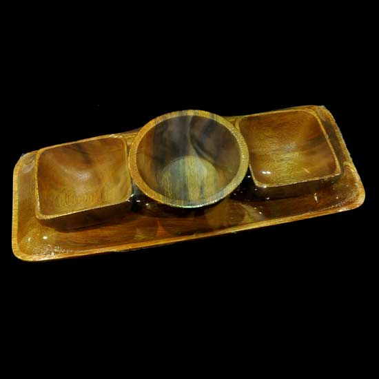 This deluxe tableware set lends an earthy touch to your dining table with the nature-inspired wooden construction. The set includes a round-shaped bowl, two square-shaped bowls, and a matching tray.