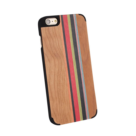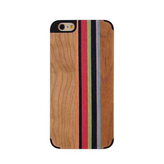 This smartphone case is carefully structured to fit your Apple iPhone perfectly. It is made of natural wood. The wooden case looks modern with vertical colorful stripes.