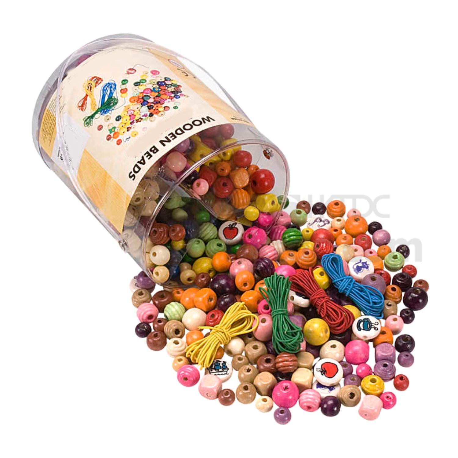 Featured here is a set of wooden beads in different shapes and sizes. The beads come in colorful designs and have holes for strings to pass through. This wooden bead set comes with strings for making jewelry and is packaged in a clear case with handle.