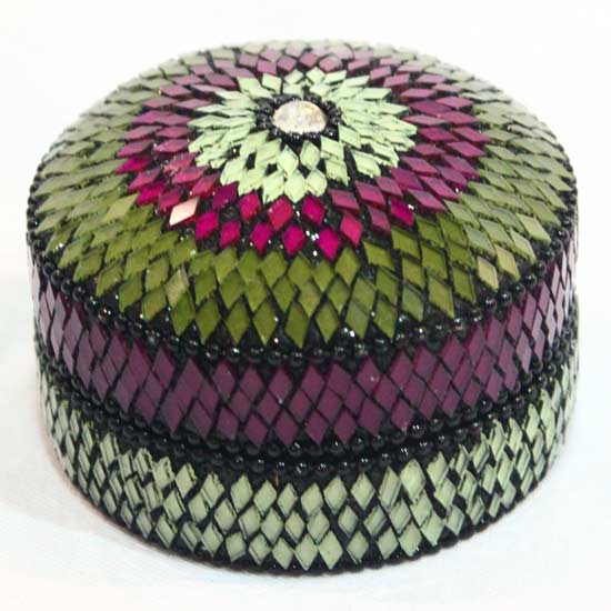 This wooden box features a special circular shape. The short body is embellished with numerous glass pieces in rhombus shape. The reflective wooden box makes a special storage item for miscellaneous items.