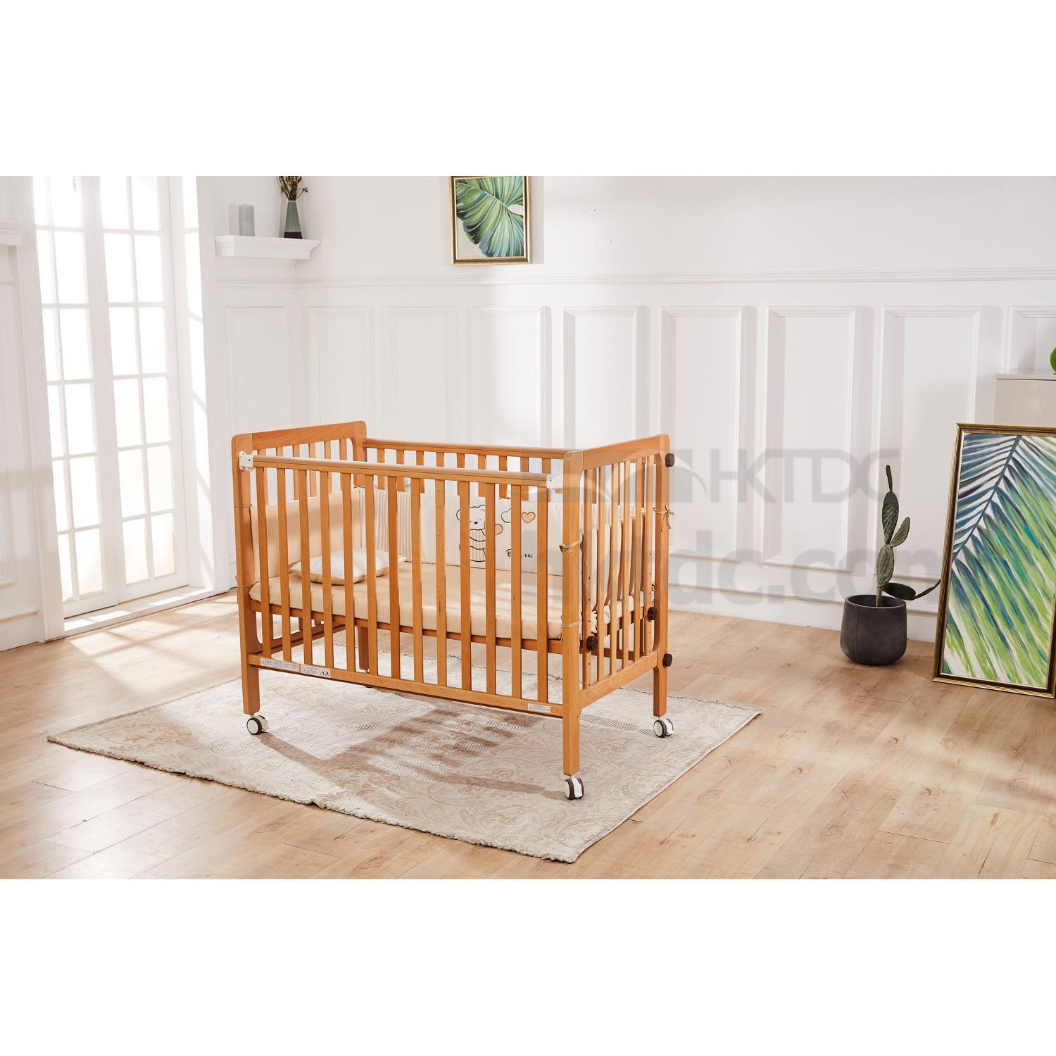 It is made in German beech, the inner size is 120x65x98cm, the outside size is 125x70x98cm, the front fence can be stored away and hide below the bed-base as storage plate, then close the adult bed.
