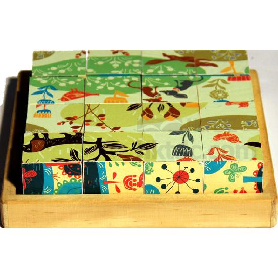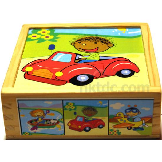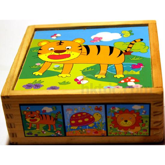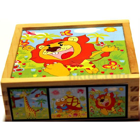 This is a funny cube puzzle with 9 pieces, that is made of quality wood. It is designed with 6 different pictures in bright colors to match complete images, catching babies' attention easily.