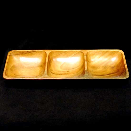 The wooden dip plate features three compartments for different sauces. The wooden construction brings a touch of sophistication. This classic dip plate makes an exquisite addition to your kitchen.