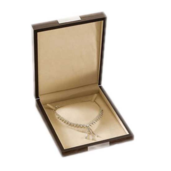 Featured is a classy jewelry box crafted with fine wood. The flat and square box is a great idea for displaying and presenting necklaces. The lined interior gives your valuable jewelry enhanced protection.