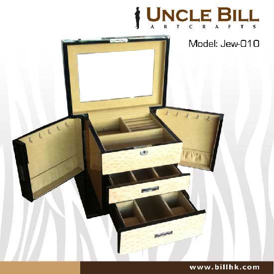 Displayed here is a timeless jewelry box that fits into any vanity table. It is designed with assorted compartments for storing your jewelry pieces in an organized way. The wooden construction allows durable use.