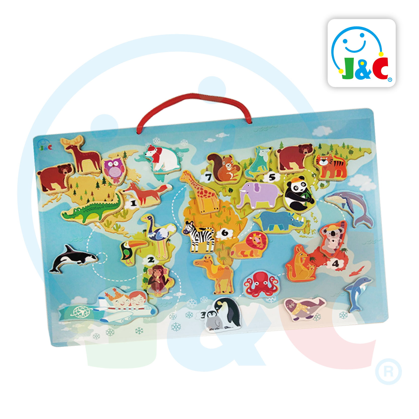 Around the world in several magnets. A fun and educational way of discovering the planet. Each magnet represents a country or region of the world, with its name, capital and an illustration characteristic of that part of the world. The big magnetic board shows the world with its continents and oceans : the colour used for each region helps to find its place. Have fun putting each country in its place and have a wonderful map of the world which you can hang on the wall.