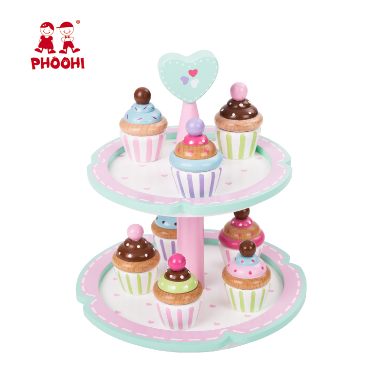 Children food play pretend baby wooden mini cup cake stand set toy for kids