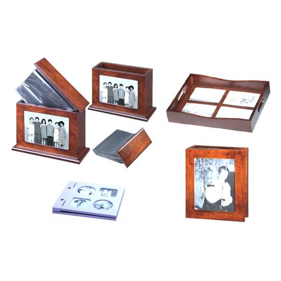 A set of desktop stationery with photo frame. The set includes a pen case, paper tray and a photo album. The set is suitable for gift and premium.
