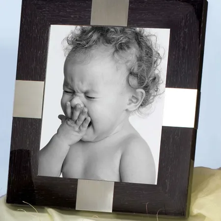 In-house designer wooden photo frame laminated with veneers and decorated with stainless steels.