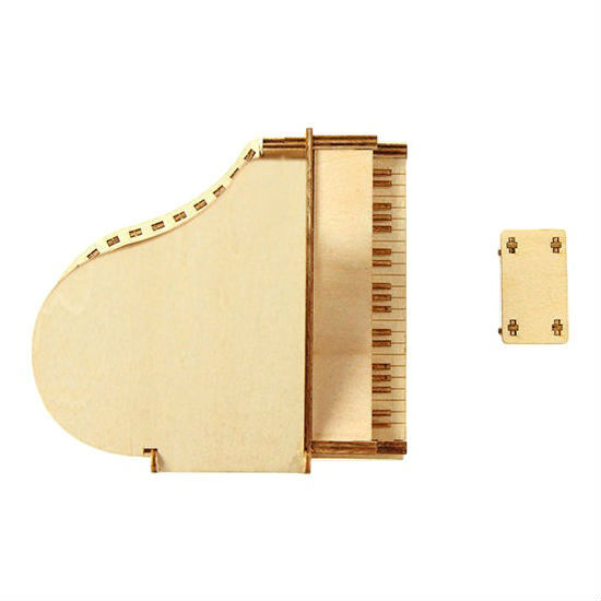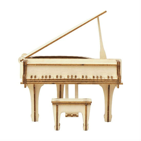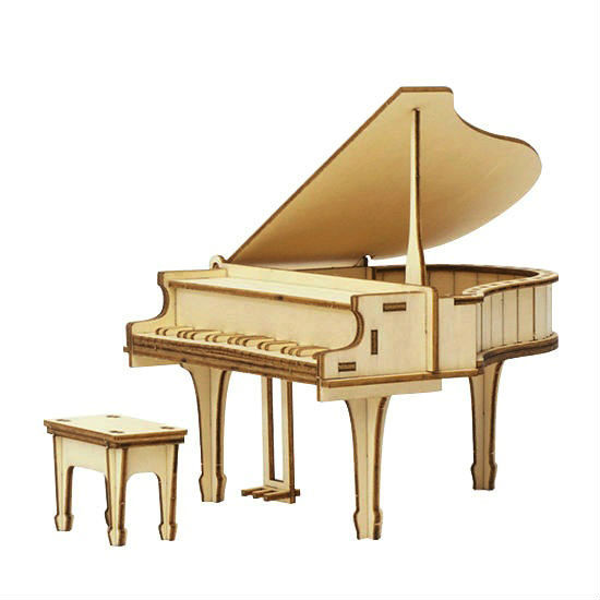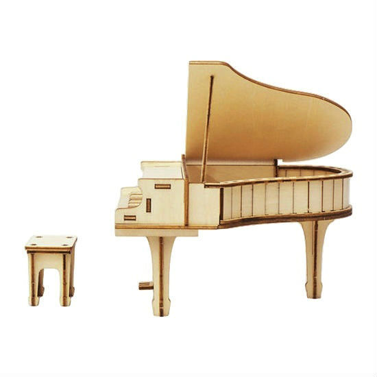 Shown here is a wooden puzzle imitating the shape of a grand piano. The 2 mm thick plywood pieces can be easily put together and form a sturdy piano once built. This piano puzzle is elegant, charming and is perfect for display.