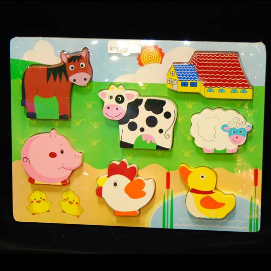 The outlined wooden puzzle toy features a theme of a cartoon farm that is appealing to little kids. The entire set is colorfully painted for a more adorable picture. This wooden puzzle is a good game to develop children's shape-recognition skills.
