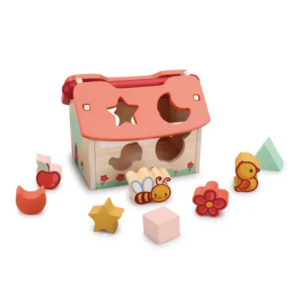 Wooden Shape-Sorter House with various shapes: apple, moon, star, flower, bee, bird, triangle, square