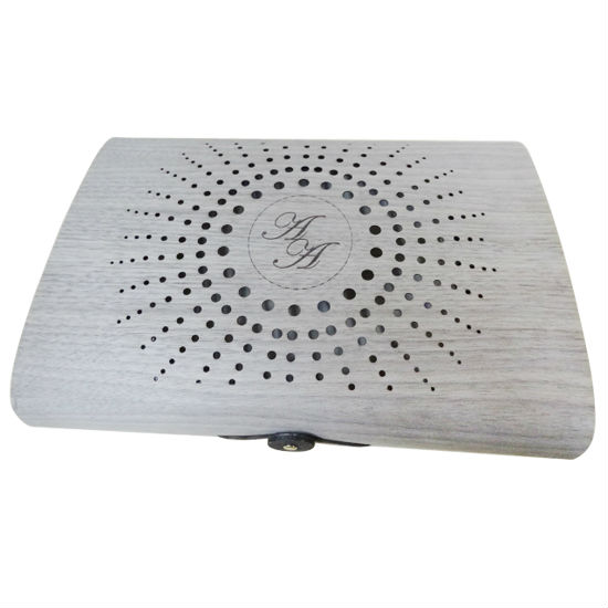 Enhance the beauty of your room with this inviting wood veneer box. Made of quality birch wood, this black walnut box comes with unique wood grain patterns, suggesting a touch of antique. The lid is scrupulously crafted with a radiated hole pattern and an engraved logo in the center for added style. Equipped with a clasp closure, this wooden storage box makes a great functional accessory to fit your room’s décor.