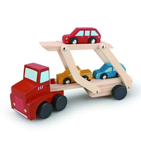 Wooden Truck Carrier with 3 additional wooden car for varying play patterns. Double decker trailer unfold to transform into a long ramp for the cars to roll on or roll off the trailer. Inspire imaginative play with the Happy Earth Wooden Truck Carrier.