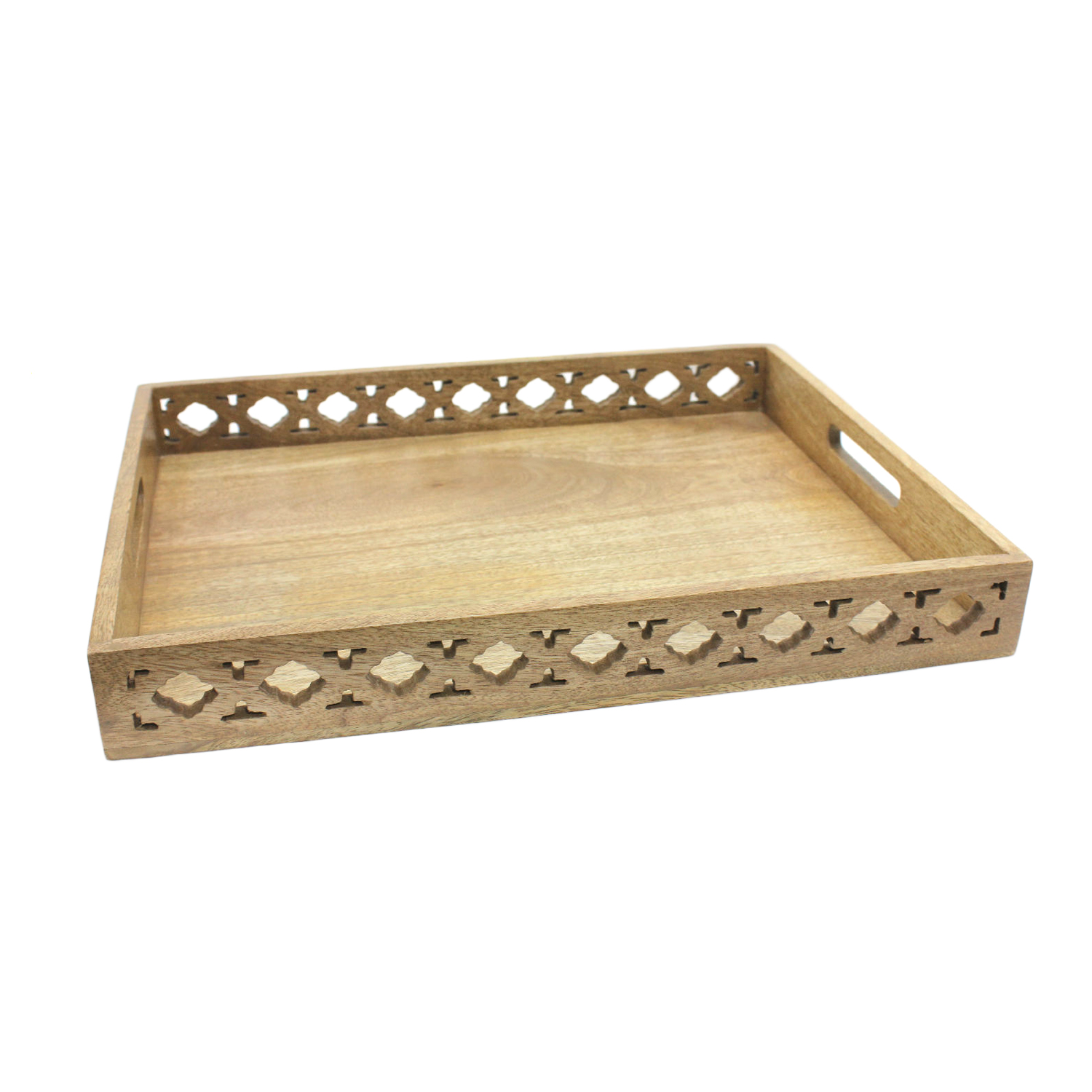Add a flaring addition to your table setting with this wooden tray. Meticulously crafted with durable mango wood, the ravishing tray is oblong in silhouette with groovy cut-out patterns trimmed along the rims to round off the design with an elegant flair. Partnered with two cut-out holes at the sides, it allows you to tote your meal to and fro the kitchen with no fuss and no muss.