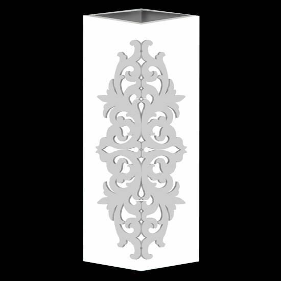 This is a wooden vase that has a diamond shape. Covered with silvery surface porcelain, the wooden vase is sleek and elegant. This classy design makes it suitable as a decorative piece.