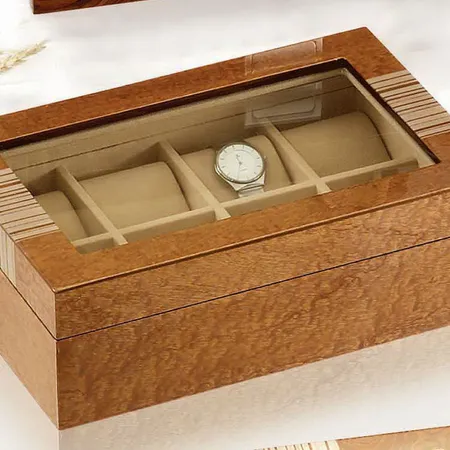 Wooden watch boxes with different veneers and sizes.
