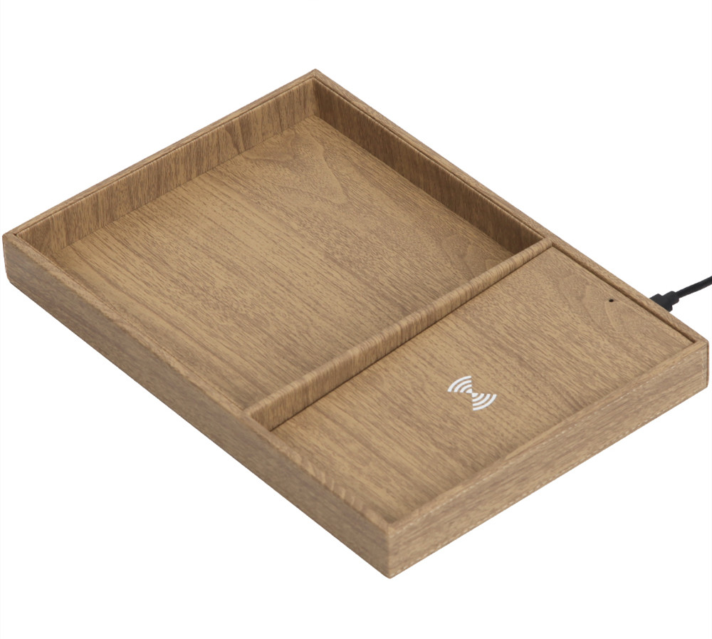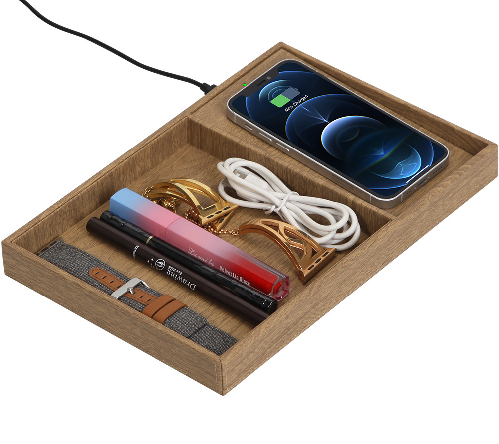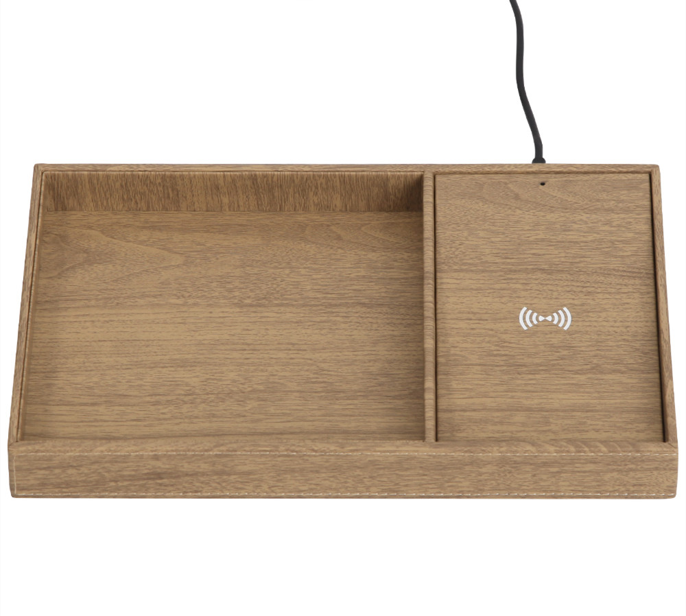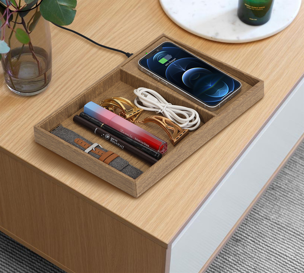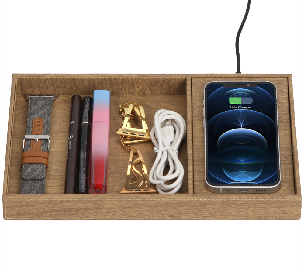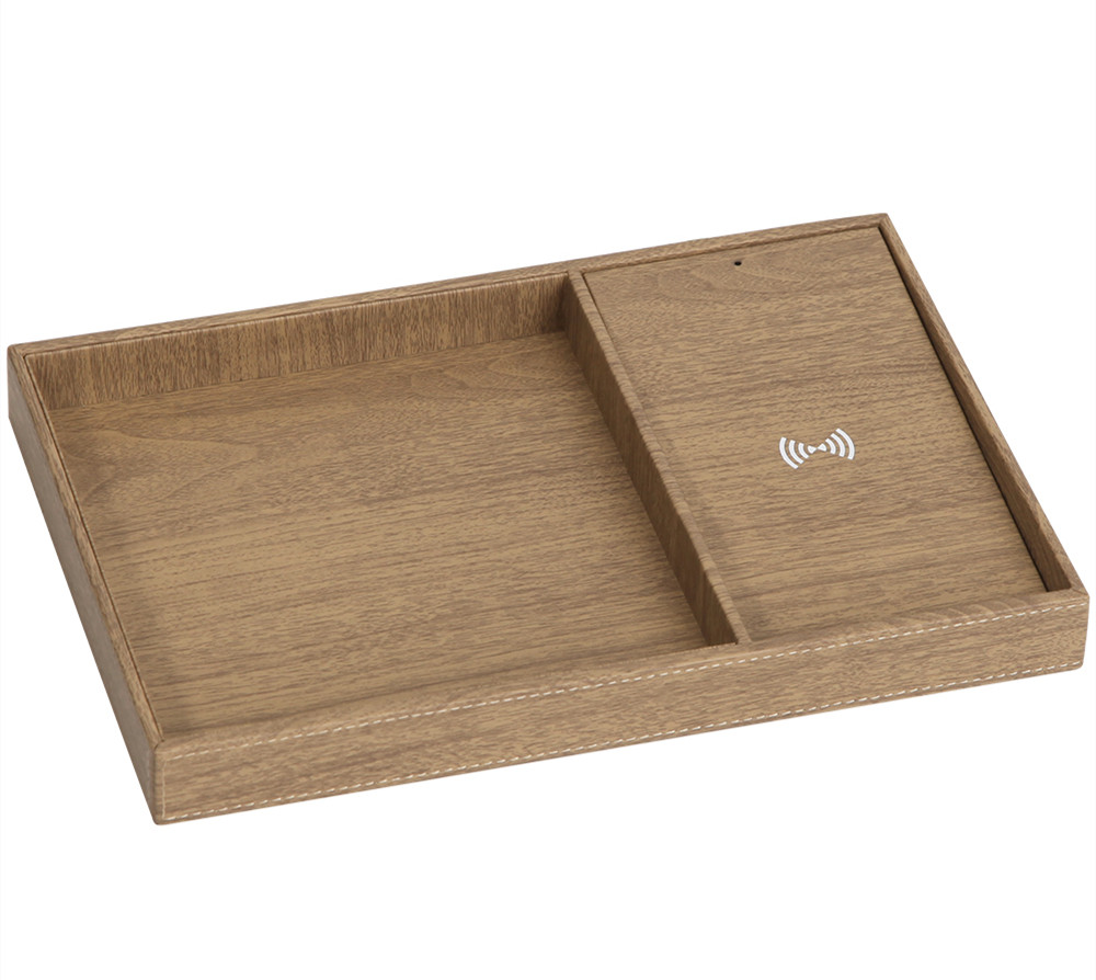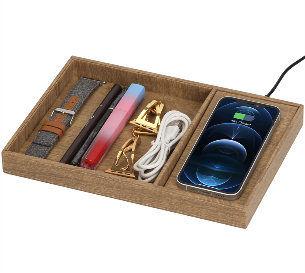 Wooden texture wireless charger valet to collect all your accessories.