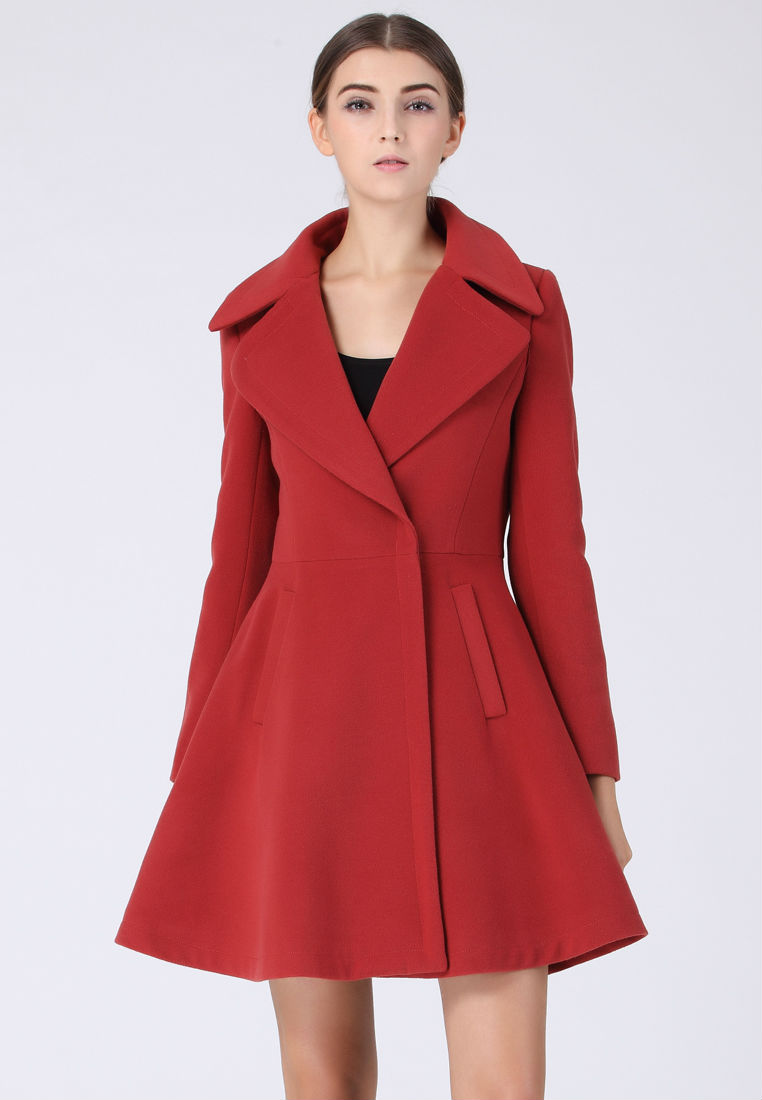 This elegant and minimalistic coat is delicately tailored with fine wool-blend fabric. Featuring a notch lapel collar, two side pockets and snap buttons, this coat has a flared hem silhouette which gives a chic and sophisticated look.