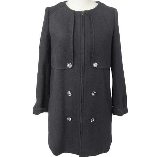 This is a wool coat for women. In a fashionable black color, the coat is designed with two rows of front buttons for a stylish look. This coat uses a seamed zipper for a slim style.