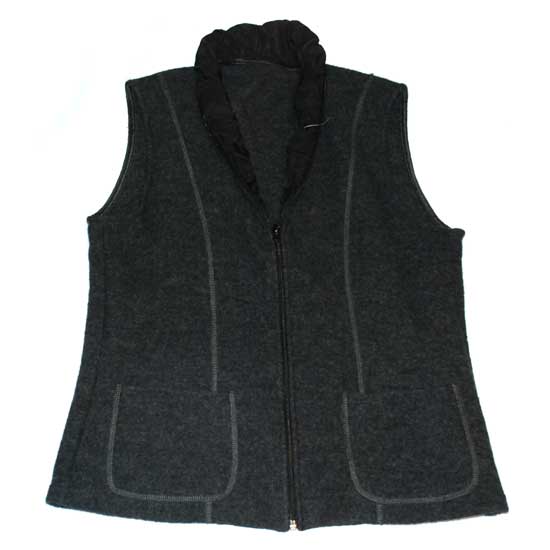 This refined vest features a V-neck with zipper closure. This vest also boasts two front pockets with explicit stitching lines. The wool jersey material keeps you warm while your hands will not be left in the freezing air with the pockets.