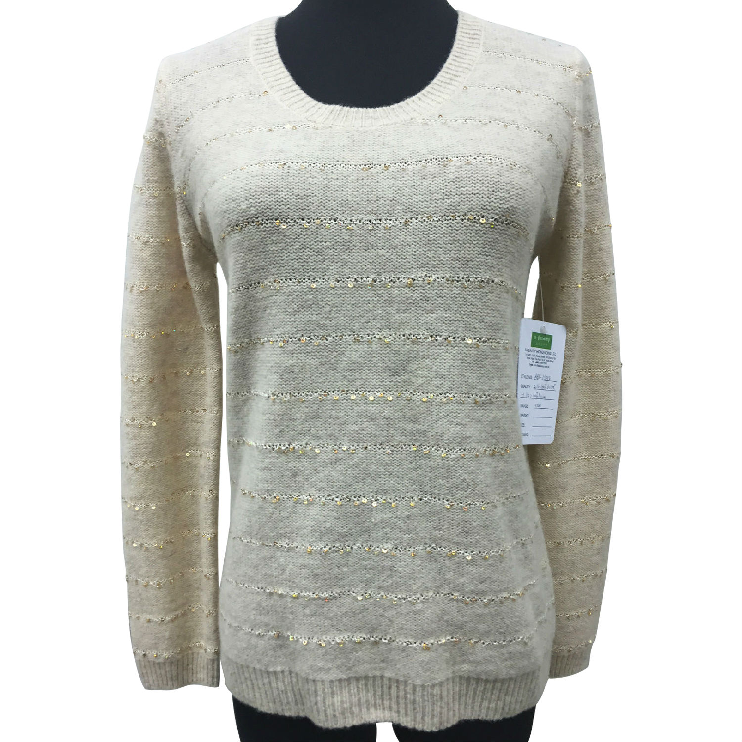 Minimalist and refined, this pullover makes a very sought-after item every single year. Coming in delicate ribbed round neck, this long-sleeved sweater has subtle stripes all over. Shimmering sequins can also be found along each stripe for added elegance. With the 100% wool construction, this quality pullover offers a warm wearing experience for sure.