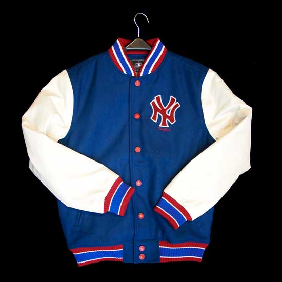 This sports jacket features a blue and white toned design accented with striped and ribbed collar, cuffs and hem. The red pattern at chest highlights the whole look. This eye-catching jacket is made of wool and acrylic for gratifying warmth.
