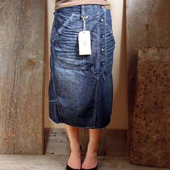 Featured here is a wrap skirt, which is made of 11oz of denim.