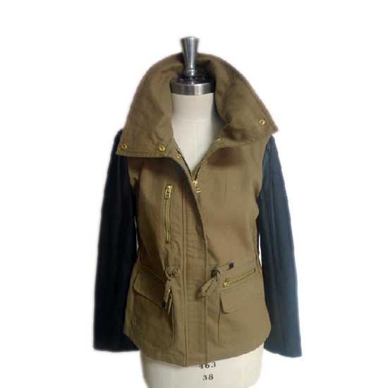 This is a jacket with a handsome and cool appearance. It features a khaki body with dark blue sleeves, showcasing a touch of uniqueness. The golden details such as buttons and zippers make the jacket look more exquisite.