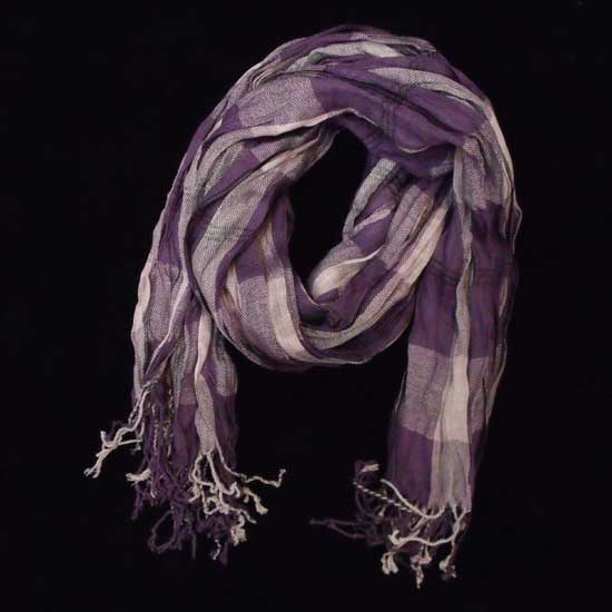 Displayed is a woven scarf that is made of acrylic. This piece is styled with fashionable checks on a ruffled surface. The scarf also features disheveled fringes for greater attractiveness.