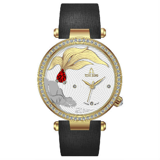 - 316L steel case with setting diamonds or Zirconia on fixed bezel - Sapphire Crystal / Glass - Emobssed dial with gold fish w/prong setting red corundum or ruby. - Italian Satin leather strap w/butterfly buckle - To be advised.