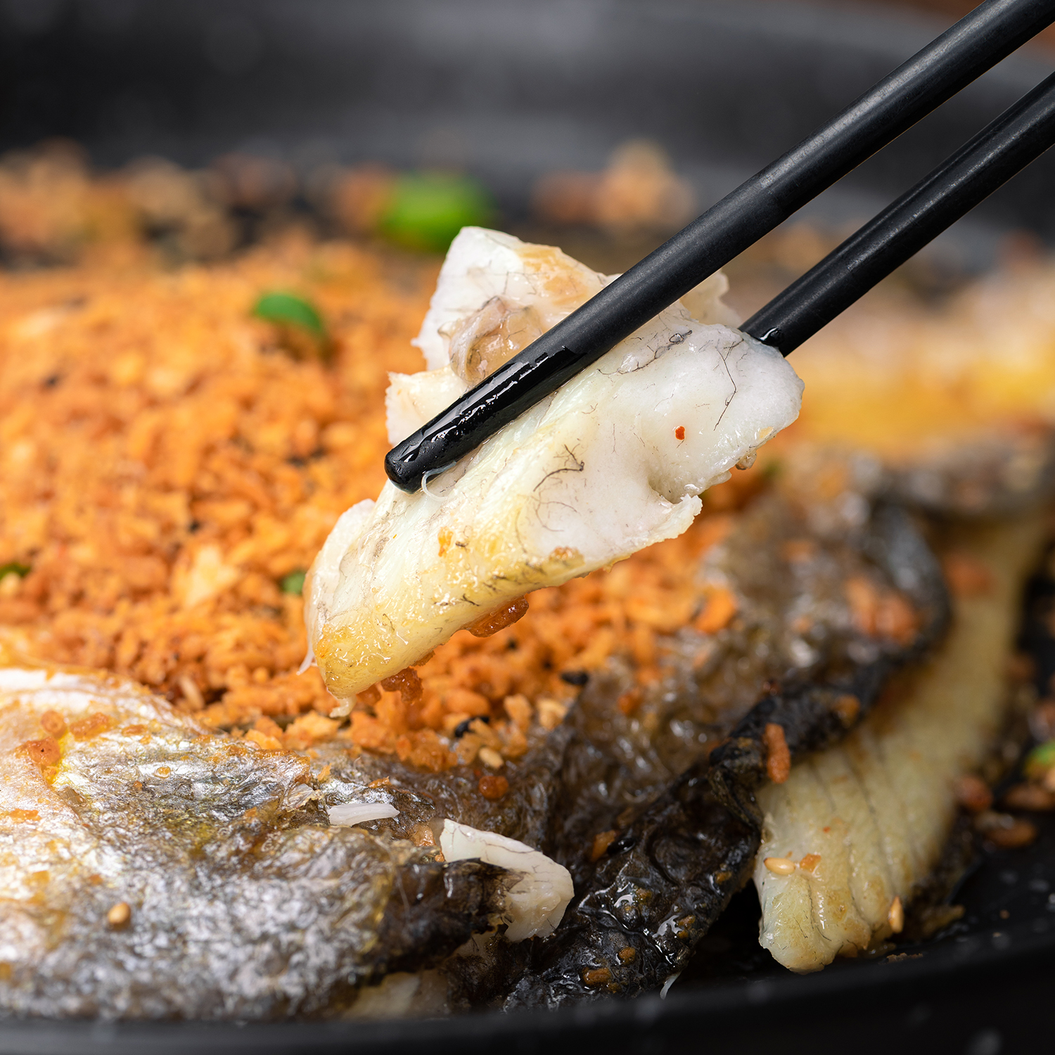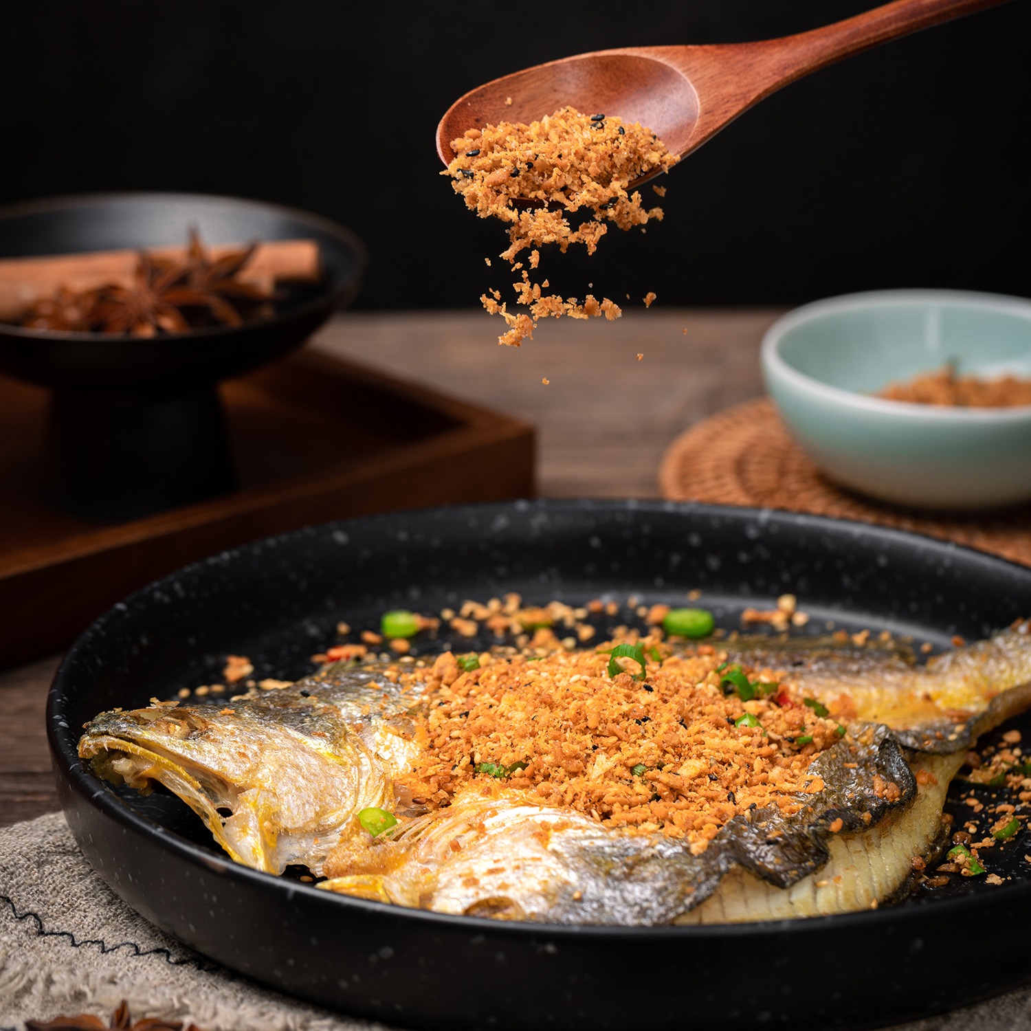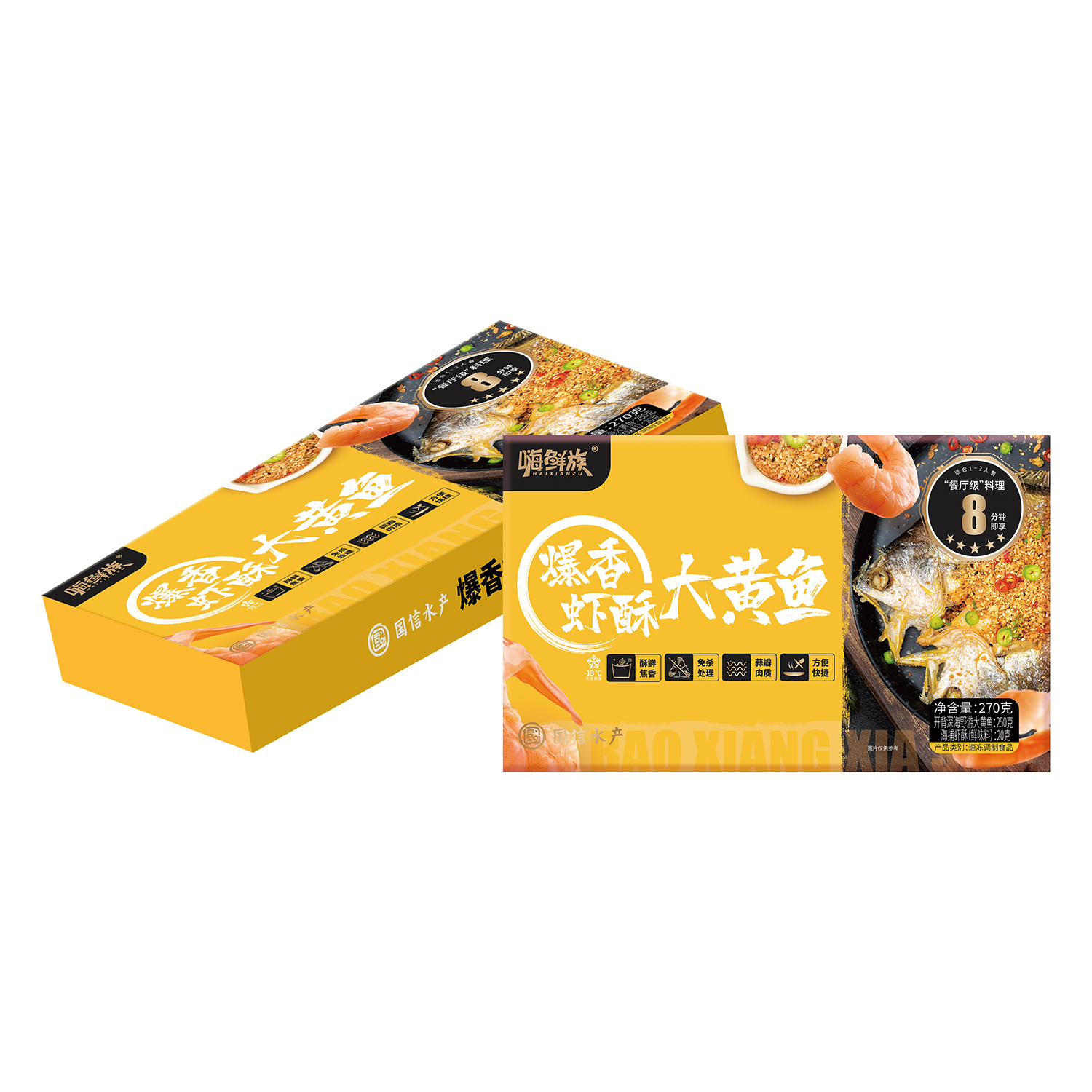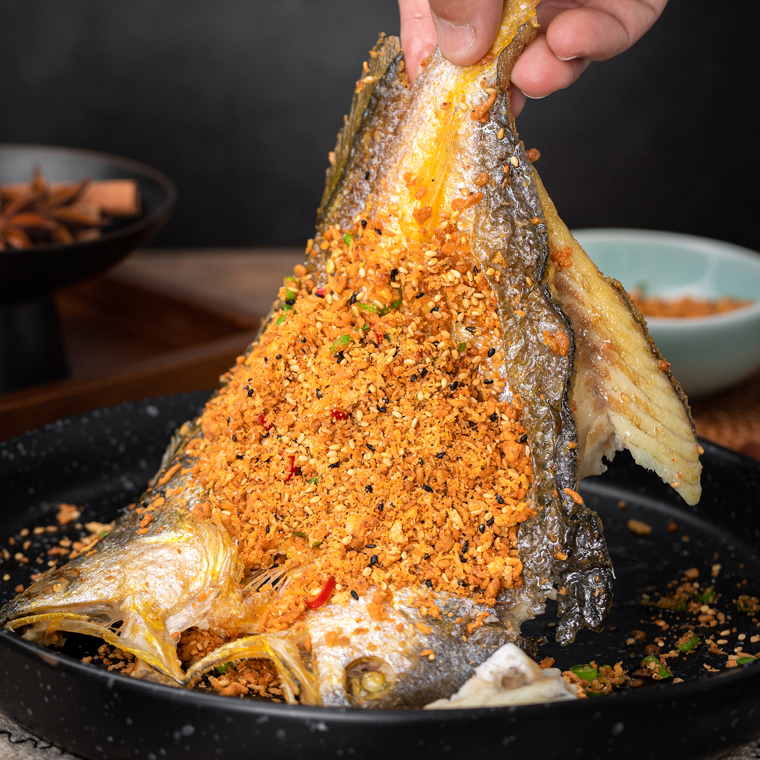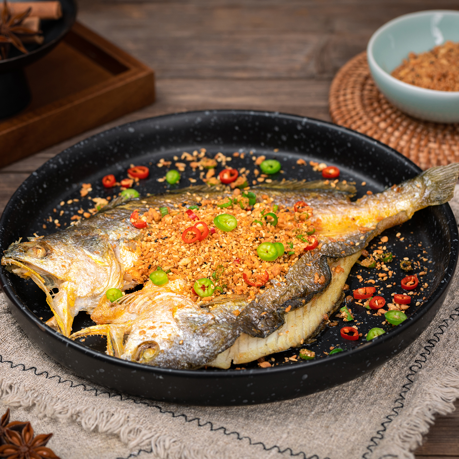 A sensational fusion of two delicious seafood for a luxurious dining experience. This exquisite dish takes the finest yellow croaker caught fresh from the ocean's depths and marries it with the irresistibly crunchy texture of shrimp crisps. Every bite of the tender yellow croaker is an explosion of flavor, while the enticing golden crust offers a beautiful contrast to the juicy, succulent fish. Not only is the croaker packed with savory notes from its expert seasoning, but it also contains rich nutrients that bodies will appreciate.