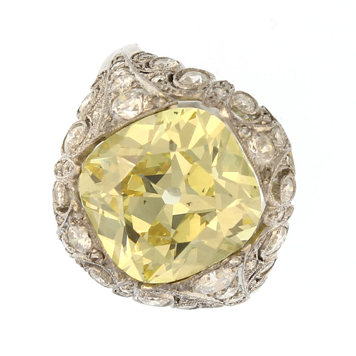 • A ring of important and intricate design, a 7.7 cts fancy intense yellow cushion-shape diamond sits in a platinum mount set with an old-cut and rose-cut diamonds