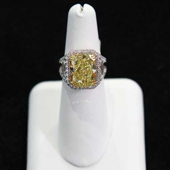 Featured here is a ring crafted in fine quality platinum. The ring highlights a yellow diamond at the center, only to be surrounded by a wreath of sparkling white diamonds. This exquisite ring exudes a touch of modern elegance with unspoken charm.
