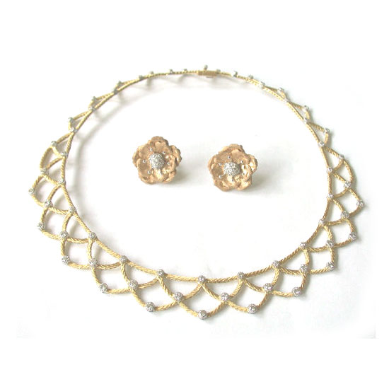 The necklace is crafted with a net-like design which looks special and arresting. It goes with a pair of blossom-shaped earrings finished with delicate workmanship. Both items are further prettified with dainty and shimmery diamonds.